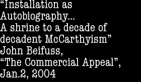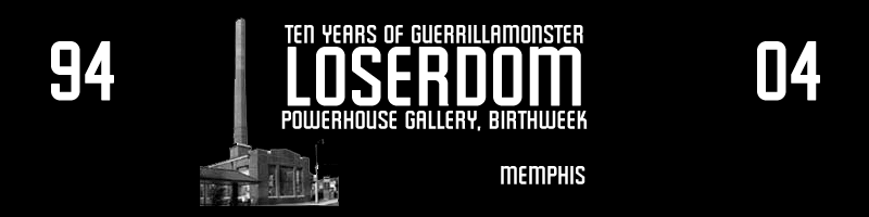 Highlights of the three night event included EMMY COLLINS on a pedestal in the main gallery as an interactive display. The previous night JMM's new superhero chick SUPER TEENAGE (Victoria Brough) went up on the block. On the opening night, folks found JMM himself on the pedestal ready for questions - or to be laughed at, depending on the patron. Three nights of live Memphis music featured a single Jack Oblivian performing lounge versions of his TEARJERKERS & COOL JERKS songs. Nicholas D. Ray & Harlan T. BoBo performed ambient dissonance from their ECCE HOMO and instrumental forays. Ecstatic POLI SCI CLONE plastered every nook and cranny of the concrete structure with his loud renditions of drinking songs. Special guests included Jane Bussman, the writer from the London News and the FACE Magazine; Musician Hartwell Littlejohn; Jim Roper, editor of MEMPHIS Magazine; Moviemaker Craig Brewer; Producer Cynthia Runions; Dr. Mark Luttrell; the legs of Barbara Luttrell; Loserdom organizers James Patterson, Nancy Morrow, and Preston Johnson; writer David Hall, sculptor Dan Spector; and Inter7.com's Catherine Kouzmanoff. JMM's wife Kim, daughter Hanna, and father John McCarthy also attended. JMM says, "Knowledgeable people lament the loss of a culture that is regional. Yet the dual juggernaut of Hollywood and New York have wiped out regionalism. Assimilation of ORIGINAL regional concepts is fantastic (like Elvis Presley's combining of Country and Blues). On the other hand, assimilation of assimilations is like mad cow disease. It's Pop Culture eating itself. That's what mass media has been doing since the death of Elvis Presley. His body is that metaphor to me. I'm just trying to make pop culture regional again in the very place it was created- and that's Memphis Tennessee." JMM shot a documentary during the show as onlookers basked in the glow of 1000 watt lights. Kaleo Quenzer, Alan X, and Emmy Collins assisted as Dan Ball took fotos. The resulting movie will be ready on Elvis DEATHWEEK 2004 and feature the Exhibit as its centerpiece. JMM is collaborating with Savana Raught as co-producer and curator on this special production which will feature a special SHOCK ENDING. Look for Savana's upcoming show in Memphis, TN at Gallery 56 in June 2004. Also check the later Summer schedule for a screening of LOSERDOM at Indie Memphis Film Festival. (Buy LOSERDOM at www.guerrillamonster.com!) ![]() |
