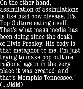 Not many Auteurs could prepare for such an out of control "ego trip" during the abounding chaos of Christmas and New Years Eve. But for JMM, Elvis Birthweek IS Christmas! He only had to move about 8% percent of his attic downtown to the beautiful old two story gallery. The show occurred on Elvis' 69th birthday (ten years ago DAMSELVIS, DAUGHTER OF HELVIS had premiered on January 8th). Different JMM films showed in chronological order each night. Always the Elvis Numerologist, JMM has centered many film shoots & premieres around Elvis Birthweek & Deathweek. JMM, also from East Tupelo, has created a new religion based on the boyhood of Elvis and his stilborn twin Jesse. This uniquely American creed is called THE GOSPELVIS and was a centerpiece of the LOSERDOM event. David Bowie also shares a birthday with Elvis. JMM factored this into the overall theme of the show, tying Ziggy's 1972 Memphis appearance into the regional meta-event... The original framework of LOSERDOM and JMM's origins in Memphis begin twenty years ago in 1984, when local art critic Donald LaBadie wrote about three young guys who were laughing at 'modern art' on display in a local museum - one of those punks was JMM. LaBadie titled the article "Something Alien In The Park" and it was published in the local Fanfare supplement where JMM realized they were talking about him! "Before I even made Art I was criticized! Careful! I might get a complex!" JMM grimaces. Twenty years later the hillbilly art student accused of artistic ignorance creates an impressive body of work that no one at the time (1986) could teach him in the local art college. Work that champions the best and most original of American concepts: comic books, rock and roll, & drive-in cinema. "When Lo-Brow art assumes Zen-like proportions, it is Great Art nonetheless." Unfortunately, the 'old guard/new guard' dramatic angle was not used by the local press to promote LOSERDOM. JMM made several attempts to contact LaBadie to invite him as the Guest of Honor. JMM wanted to extend a hearty handshake to the art critic with a fitting caption that could have only read "Hi-Brow meets Lo-Brow". Unfortunately LaBadie was a no-show. ![]() |