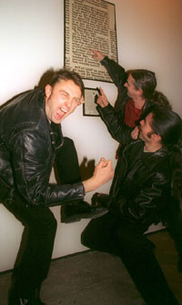 Angry Laughter: JMM and fellow Rockroaches John Prescott and George Cole laugh at the framed Labadie article at the LOSERDOM show.
