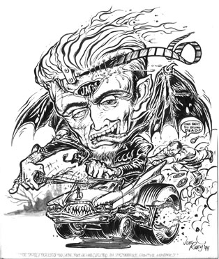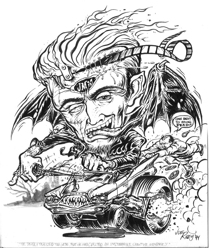 I remember Joe (Spring 1996) pulling up at midnight to my folks house in Mississippi just as Jack Oblivian was about to be grabbed by mud-caked zombie hands through cheap plywood that was about to fall over on everyone underneath. Joe used his truck to stop this potential disaster - then unloaded the seven foot angel wings that he built himself and we stored them in the carport. These were to worn by starlet Mary Wills in a crazy Guitar Wolf scene. Joe got really mad when my dog ate most of the angel wings later - but Joe fixed them right up. Joe also did all the multicolored squibs in the Hippie Death scene and the Old Mother make-up for Ghetty Chasun (in an EC Comics style that Joe knew emphatically). I remember I owed him some money for the work he had done on SORE LOSERS and he was anxious to leave and return to Dallas. We had to wait for Kim to return from the bank in Memphis with his fee. Kim was involved in a bank hold-up and was lucky to get out of the bank with her life. Joe accepted this as fate and I had to pay him later. Joe also designed the three-necked "Guitaroboto" for the GUITAR WOLF Sony videos I did in 1997. (Jack Taylor and Billy Wolf are also casualties of the Sore Losers era.) I have a black light Glenn Strange Frankenstein poster that Joe drew. I also own one of his immaculately sculpted Herman Munster resin heads. If PSYCHOTRONIC magazine were still around I would fully expect Joe to be listed in the "Gone But Not Forgotten" section. You got your wings Joe. http://www.myspace.com/joerileyartist JMM Memphis If anyone who knew Joe or has cataloged his art, then his family would much appreciate knowing about it or having a copy. Please contact me at jmm@guerrillamonster.com or www.myspace.com/aprilsims ![]() Joe Riley draws JMM as a souped up speed crazed pop culture madman! |
