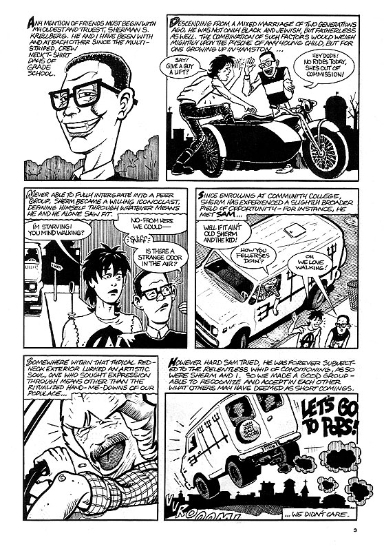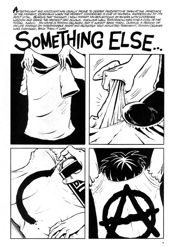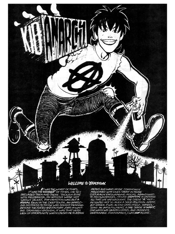 The first five pages of Kid Anarchy were created on spec by George Cole and Mike McCarthy to pitch to Gary Groth at the 1989 Dallas Fantasy Fair in hopes that he would publish the series. He did! Three years and three issues later the 32 page magazine format series came to an end with script #4 ("Sludge") left undrawn by McCarthy.