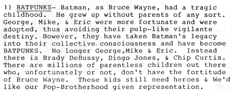 I look outside and see the rain... It's been months since George's birthday and to tell the truth, I forgot about it. When I did remember it (I think he reminded me), I later thought, "Screw him, he never gives me anything - not even when we lived together!" Well that's not entirely true. I never received many material things from George (he did cover the rent once or twice), but I did get lot's of inspiration and story ideas from our Cole-laborations together. That list of team efforts is an unfinished and obscure (albeit timely) batch. If I have my way about it all these projects will one day come to light outside the pages of this volume in one form or another. KID ANARCHY, JUNKIE RATS & NOSEDIVE Fanzine were doomed projects and one-shots borne out of the 1983 & 84. And in them lay the seeds of POPCORN! KID KID ANARCHY came about one evening in 1983 as Chuck Moonchow, George Cole, and I were sitting around my room. We were creating characters for some stupid contest the Comic Buyers Guide was running at the time. Chuck came up with a creature who ate Outer Space and George had the concept of CAPTAIN ANARCHY.