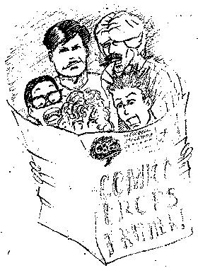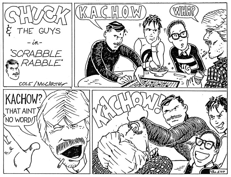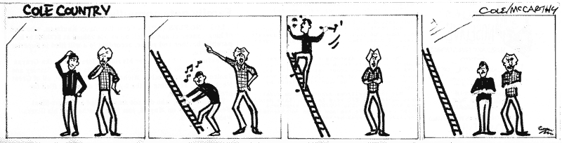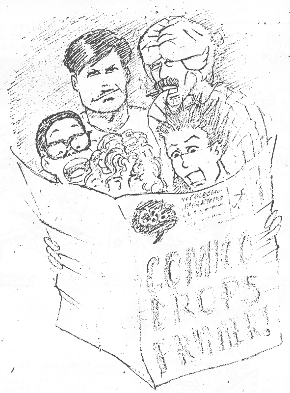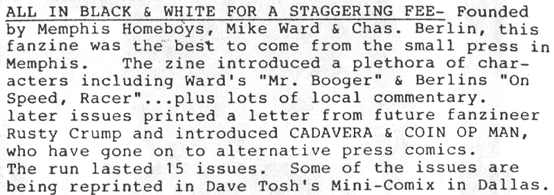 I disagreed with George on two items: The original name "Cole Country" (we came up with POPCORN while standing in the frozen foods section in Piggly Wiggly one night), and in refusing to draw the John Lennon strip which I thought an untrue representation of myself (if not the other people) in that particular strip. It is included here, undrawn, nonetheless. Around that time, the end of '85 or so, POPCORN was bludgeoned in some corner of our brains (okay, my brain maybe). I had been invited in on a Memphis zine called ALL IN BLACK AND WHITE FOR A STAGGERING FEE by Mike Ward (aka MR. BOOGER) and Chas. Berlin (aka COIN OP MAN).