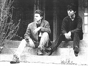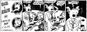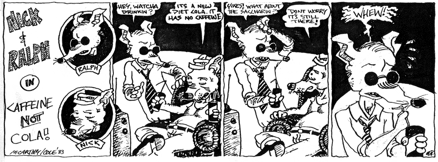 But the rebellious nature and cultural ideas behind the KID were fading. Like Hardcore was fading. The pop/social signposts of the early '80's are now taken for granted, sterilized, and mass-marketed. The Dungeon & Dragon tapes played on, although those days were long gone. Our old friends, like John, had dropped out of sight and the new ones begain to get under our skin. To fill the void, George read Bloom County alot. I worked on my own ideas, like CADAVERA, whom i created initially on a trip back from Dallas with fellow BATPUNK Eric Page. Comico, a new publisher, showed interest in KID ANARCHY but later cancelled their amateur showcase book "Primer". The KID was shelved alongside Proudhon and ARCHIE Comics. During this time, George convinced me to do thumbnail sketches of Chuck Moonchow and Sam Woodchuck (characters in KID ANARCHY) for a "Bloomish" strip called COLE COUNTRY (guess who thought that title up.) All that soon changed to drawing ourselves in the strip. More of that self-idolization spirit again. We figured that was doing Bloom County one better. This was POPCORN!