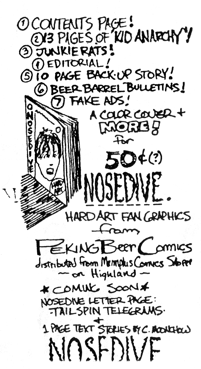 I remember discussing NOSEDIVE with George as he and first travelled back and forth to Memphis. The title was taken from a joke off the Letterman show. It was to be a forum for KID ANARCHY and to glorify our retentive childhood traits; shared comic book memories like the Flash Veggie-Mobile or Four-Armed Stories). There could also have been some Andy Kaufman worship in it too (the best and most misunderstood comedian ever!). But don't look for NOSEDIVE in the cardboard box of your favorite haunt. It doesn't exist. I mean, there are only so many hours in an evening. |