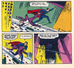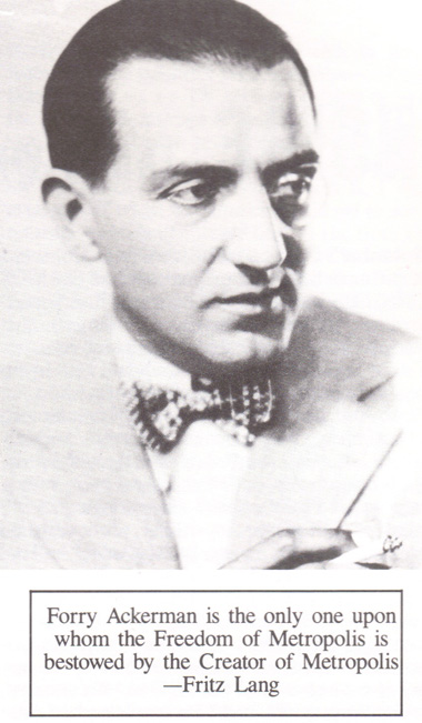"The influence which Fritz Lang's masterpiece had on almost all media was overwhelming. However, it's sheer imaginative power over two young men from Cleveland created a cause and effect that still resonates today in almost every phase of modern American life. Jerry Siegel and Joe Shuster were huge fans of the film, Metropolis. This lead to their collaboration on one of the first fanzines, entitled SCIENCE FICTION. In the third issue of the 'zine, they brought to life an unnamed bald evil genius who menaced the world. In particular he menaced a reporter named, after their good friend, Forrest Ackerman. When the story saw print, Jerry wondered if the title of the piece could not be used for a hero instead. So REIGN OF THE SUPERMAN became just SUPERMAN. And to show their gratitude for the film that inspired them, Superman made his home base in, where else, Metropolis." ~ Mike Curtis |