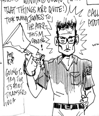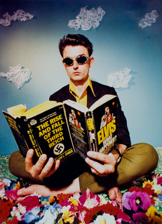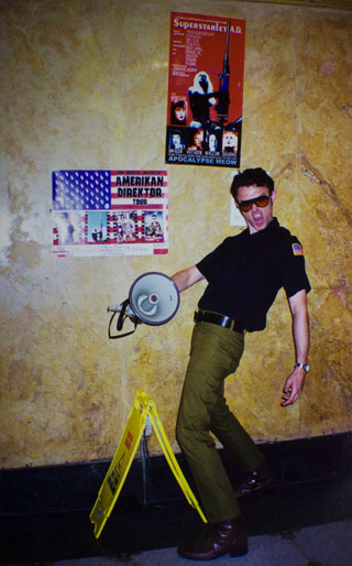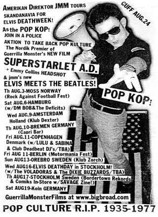 In the year 2000 I went to Europe (and Scandanavia) for the first time. I was to show my newest movies SUPERSTARLET A.D. + ELVIS MEETS THE BEATLES. I didn't want the event to go to waste as just any old film tour, so I created an image called POP KOP, culled from thrift store finds (Memphis Police Shirts), my tight Farah pants (a hold-over from the Vice Party Tour), 'beatle-boots, blues blocker shades, and an Elvis-Jesus belt buckle. Last, but not least, a Radio Shack megaphone in which to address the throng who turned out to see my movies. But what would be my message?