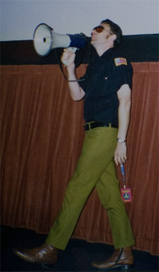 I would always walk down from the back aisle, siren blazing on the megaphone, do my damnedest to make people entertained, and introduce the films. The speeches that got the best response was the Chicago Underground Fest and Mill Valley. The worst show was Brooklyn, New York at the Stinger Club. The New Yorkers didn't like the near proximity of the bull horn nor the crypticism of the message. Of course, the MINK LUNGS were quite good. Ultimately I would be the Pop Kop for that year's tours and when it was over, it was time to retire the image, to make way for another rhyming named persona. Soon I would don a cape and become SUPER TUPELO and then even later I would become LATE GREAT. With that, the cycle of glam names came to an end.