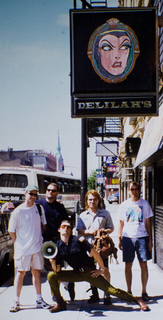 Lots of grown men with shorts: Director of Photography Steven Oatley, Producer Mike Miller (and owner of Delilahs), the POP KOP, a mysterious Chicago pop artist, and musician Poli Sci Clone...on the eve of the Chicago Underground Film Festival, 2000. Photo by Bruce Saltmarsh.