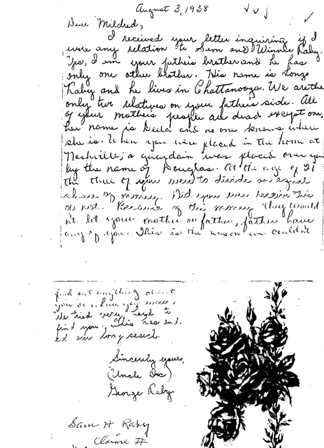 Mildred and James visited the graves of their parents, as they started to the cemetery memory came flooding back to James in a flash, and without direction he flew to the grave of his mother, falling down on his knees he gave thanks for finding his sisters, for the wonderful foster parents they have and for finding his relatives. ![]() They were directed to their mothers parent's home place in Chattanooga. Here the only living member of the family, an aging aunt, still resides. (ed.: What is her name?) The welcome here was everything but warm. Probably due to the fact that at the death of her sister and one brother she inherited not only the massive home-place but a whole sub-division in the city. The children, whose parents died so long ago, were not asked to enter their grandfathers home. ![]() The home where their mother grew up along with their aunt. They wer told that relatives or not, strangers were never asked to enter the house. Mildred begged so hard for a picture of her mother whom she had never seen that auntie finally handed her one out the door bidding her good day. ![]() These children, with characters, who are highly esteemed in their community and the surrounding area of Northeast Mississippi were denied their request to photograph the massive house where their mother was born. James said, "A little rain always follows a lot of sunshine, but we could have loved our mother's sister so much". ![]() Uncle Lon Raby, their fathers oldest brother gained new strength finding his nieces and nephew and was able to visit them at their homes in Jericho last weekend, along with four of their Raby cousins. The aged Uncle was afraid that he would not live to see the early winter reunion, at which time Jane and her family from Arkansas will join James, his wife (Sarah), their three husky sons (Roy, David, and Danny), and Mildred and hubby, John McCarthy, in a reunion at Uncle Doc's home in Chattanooga. ![]() |