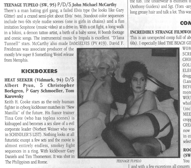 There's a man hating girl gang, a failed Elvis type (he look like Gary Glitter!) and a crazed semi-plot about Elvis' twin. Standout color sequences include two '60's style nude scenes (one is a girl in chains) and a fun imitation Scopitone (music video) at a drive-in. With a cat fight, a long walk in a bikini, a demon tattoo artist, a birth of a baby scene. H bomb footage and comic songs. The instrumental music by IMPALA is excellent. "D'Lana Tunnell" stars. McCarthy also made DAMSELVIS, DAUGHTER OF HELVIS (PV #19). David F. Friedman was associate producer of the mostly b/w super 8 Something Weird release from Memphis.