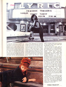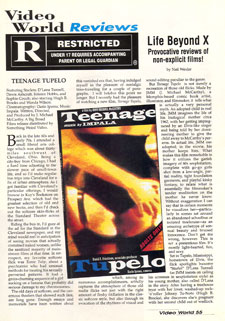But for all fans of pretty girls in film, TEENAGE TUPELO is in the final analysis a Showcase for a Starlet - D'Lana Tunnell. Though Dawn, Kristen, and Sophie ain't small potatoes.) Photographed by Darin Ipema with lighting that called to my mind such diverse influences as Josef Von Sternberg, old silent films, as well as the bounced light of a 60's urban nudie, this flick is a visual feast. Just try to forget D'Lana's big beautiful sad eyes or luscious lipsticked mouth ... or her lovely breasts or warmly evoked thighs. You won't be able to! Ah, the naked girl movie has triumphantly returned, so order it today. The catalog number is #5523 and tell 'em VIDEO WORLD sent you.