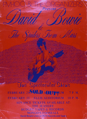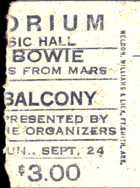 (All these wonderful images (used w/o permission) from the glorious book "MOONAGE DAYDREAM" Photographs by Mick Rock / Text by David Bowie (University Press) & additional info: "David Bowie, We Could Be Heroes" (Chris Welch, Thunder's Mouth Press) ![]() The Ellis Bowie ticket provided by Bob X. To read Bob's essay on attending the September 24th concert, please click here. |