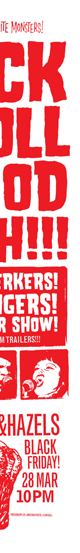 (Five Fingers - Five songs): HEAVEN (encore: POSSIBILITIES by the Viletones). Susie and I switched instruments on the last two songs so she could play sax. The show came off like a midget hooker; short and sweet. How many more FINGERS shows could there be? Is this all she wrote? Kinda sad when you know the kids in France dig this Memphis shit. What's a band to do when life interferes with Art? Don't force me to answer that, I might give the wrong answer. Anyway, Our one and only #1 vinyl record is coming this Summer (are you listening European labels?). Starting in May ten songs will be available in hi-quality at iTunes and for streaming at our My Space page (click on link below and become our FRIEND!) As I write this, BETTY BUTCHER'S real life counterpart CORI DIALS beams from Memphis billboards promoting another dead film festival. It won't be long before a Mexican restaurant takes her place. We're looking for another excuse to rock. Next time, *The "actual" 'Mid-South Con' (a long running Memphis-specific Sci-Fi Fantasy Convention now stalked by ancients, gamers, and mead makers) was actually our competition that night. If they really wanted a comic book panel, they should have come to our show! See the full DON PERRY FOTO GALLERY of images from the BLOODBATH! COMING SOON! SCENES FROM A BLOODBATH: Fingers Live at Earnestine & Hazels! BLOODBATH poster designed by BRIAN DIXON and MIKE McCARTHY. SILKSCREEN PRINTS available $20 postpaid from master printer ROB T. Please inquire at litebulbt@bellsouth.net Special Thanks to my Guerrilla Monster Crew that night: TOM WAYNE, HG RAY, CHUCK SCOTT, with additional camera help from RICH KIMBALL. Kudos to LEE PEYTON who handled the door. CAMERON KNIGHT who manned the video projector and RUSSELL and MARY at EARNESTINE & HAZELS. |