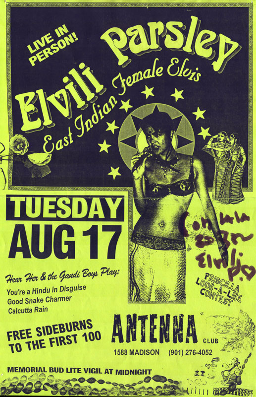 'King's Den' on drum, 'O.J.' on keyboards, 'Lipstick Pickup' on Sax, 'Cello Biafra' on (you guessed it) but he also doubled with 'Lipstick' on bass guitar. 'Betty Butcher' on singing and nice shoes. 'Johnny Oddsblood' on lead guitar. "Thin White Trash" on nervous rhythm. ('Lipstick' had shared the stage with 'Johnny O' some decade and a half before - but in different bands: She as Elvilie Parsley, He as HELVIS. both twisted Deathweek impersonators) It was me and Johnny what stumbled into The Antenna club back in 1983 to a sensory overload of the Pistols playing on the many TV screens that adorned the Antenna back then. It was the only way for some to see rock and roll videos. Just because MTV had just started didn't mean you were gonna get the Ramones 24-7. Hardly not at all. Johnny and I played the old Antenna fifteen years earlier and this was our return. Not nostalgia, but an observation on never ending self-creation and a nod to the inner history of a blighted urban area that created rock and roll. So what if CBGB's was the first. Nothing ever happens until it happens in the South. Before this place was the Antenna Club it was the Well (the Ramones played the Well), and before that it was the Psych Out Club in the sixties. In the nineties it fell through many capable hands, always a club, and then a lady named Sharon opened it as the Madison Flame in the late nineties. Ross Johnson, venerable Memphis musician who has played with the likes of the Malverns, Jeff Evans, Jon Spenser, and Tav Falco, is writing a shelved book on the Antenna Club. Never ending self-creation.