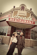 "Photographer Maggie Louie and I were in search of a restaurant facade for my Memphis Spoon photograph when we decided on the Arcade (great burger!) We arrived in a bit of a rush since I was leaving for Australia the next day and Maggie had a deadline of her own. Then I saw a vision of World War 2 loveliness. It was Memphis Belle APRIL NOVAK dressed to the nines getting out of a car near the empty parking lot where the Arcade Hotel use to be. Her friend Starla Steward Holl was there to photograph her and a soldier friend soon to return to Iraq. The fateful (and accidental) pairing of me and April worked out well for both photographers. Memphis may have lost their namesake aircraft but we still got April Novak! JMM".