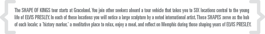 Each of these locations will be honored with a sculpture (or SHAPE) inspired by Elvis and selected in an international competition of artists. Each SHAPE serves as the anchor of it's locale—a historic marker, a commemorative artwork, and an invitation to reflect on the Memphis that shaped the KING.
